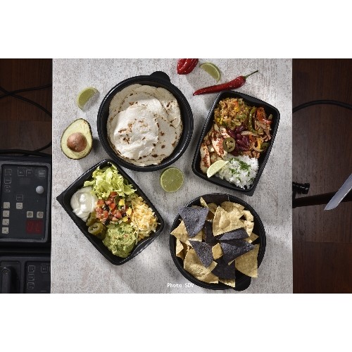 Nachos de maïs bleu et jaune, tortillas de blé à garnir avec guacamole, pico, fromage mex, riz mex, coriandre, citron vert, haricots, effiloché de boeuf et poulet Al Pastor