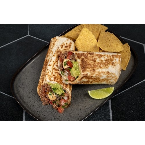 Grande tortillas de blé garnie d'un éffiloché de boeuf aux épices mex, de guacamole et d'une sauce au piment chipotle.