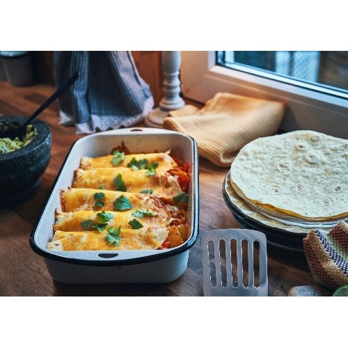 Gratin de tortillas de maïs garnies d'une farce de boeuf aux épices mexicaines.