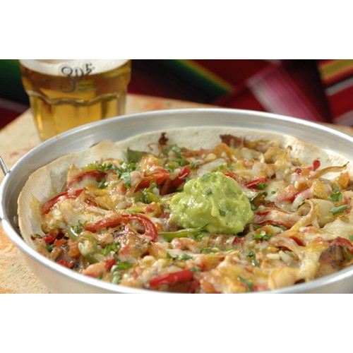 L’authentique marmite du cowboy texan : tortilla de blé, légumes à la mexicaine, baked beans, poulet mariné et sauce rouge, le tout gratiné au four et agrémenté d’une boule de guacamole. Garniture au choix : volaille ou bœuf.