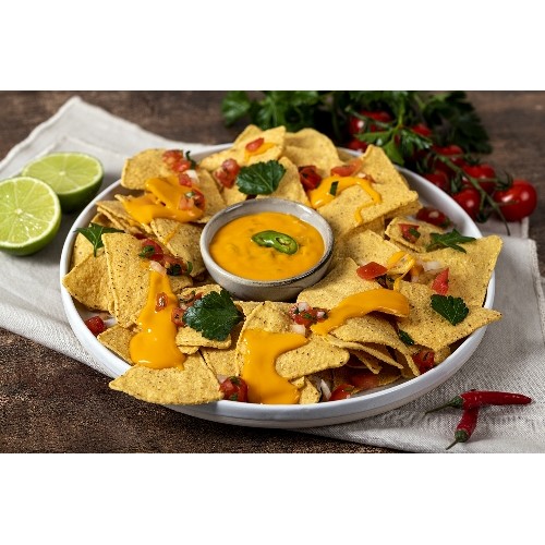 Assiette de chips de tortilla chaudes nappées de sauces cheddar fondante pour une entrée à partager.