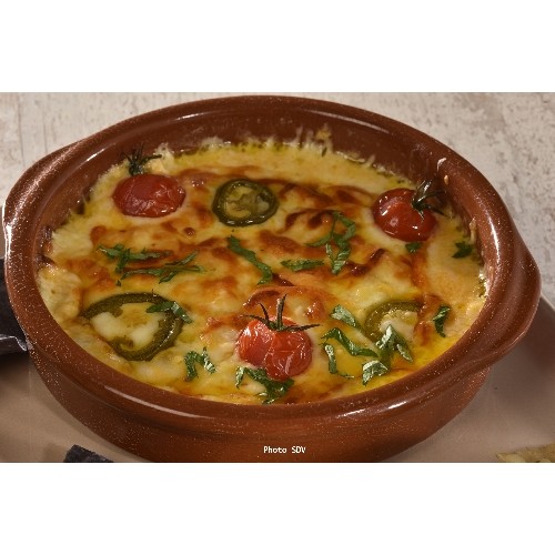 Fromage fondu avec piment accompagné de tortillas chips à picorer.