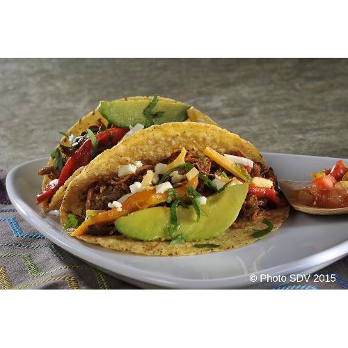 Taco de maïs garni d'éffiloché de porc, lamelles d'avocat, poivrons et mélange mexicain.