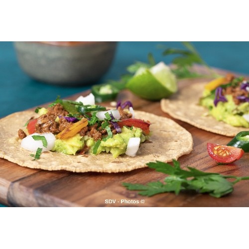 Des tortillas chaudes garnies de viande hachée, poivrons et haricots aux épices mexicaines avec salade, tomates et coriandre fraiche.