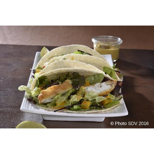 Tortilla de blé garnie de salade sauce curry mangue, cabillaud pané et dés de mangue.